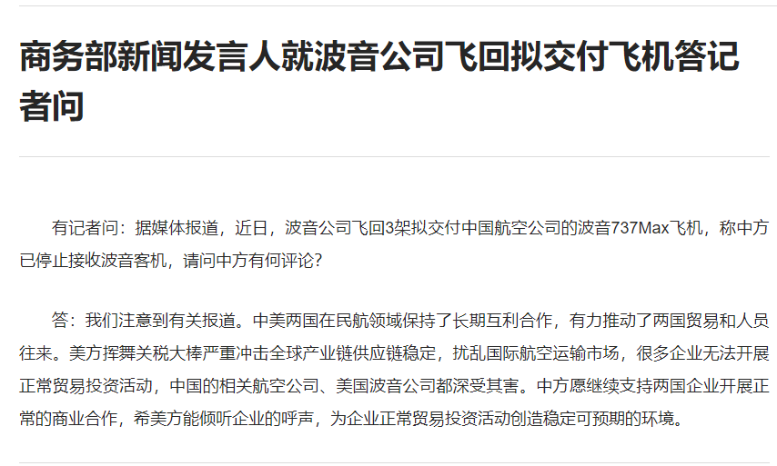 商务部新闻发言人就波音公司飞回拟交付飞机答记者问商务部新闻发言人就波音公司飞回拟交付飞机答记者问