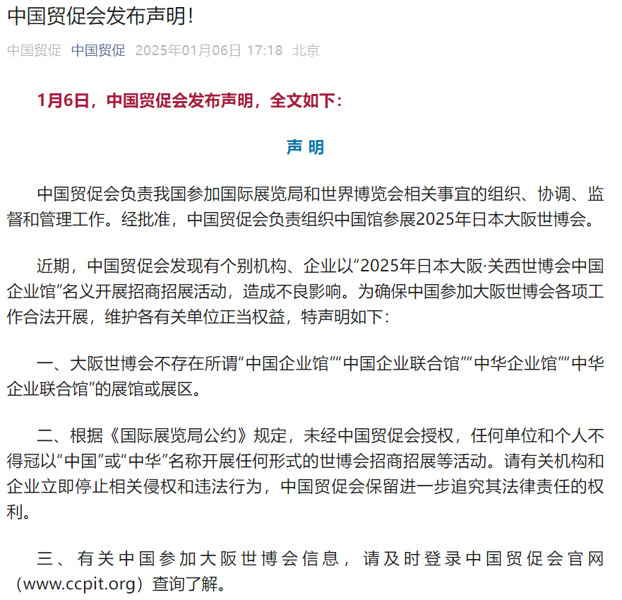事关中国参加大阪世博会,中国贸促会发表声明事关中国参加大阪世博会,中国贸促会发表声明