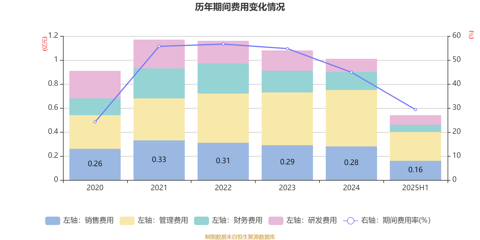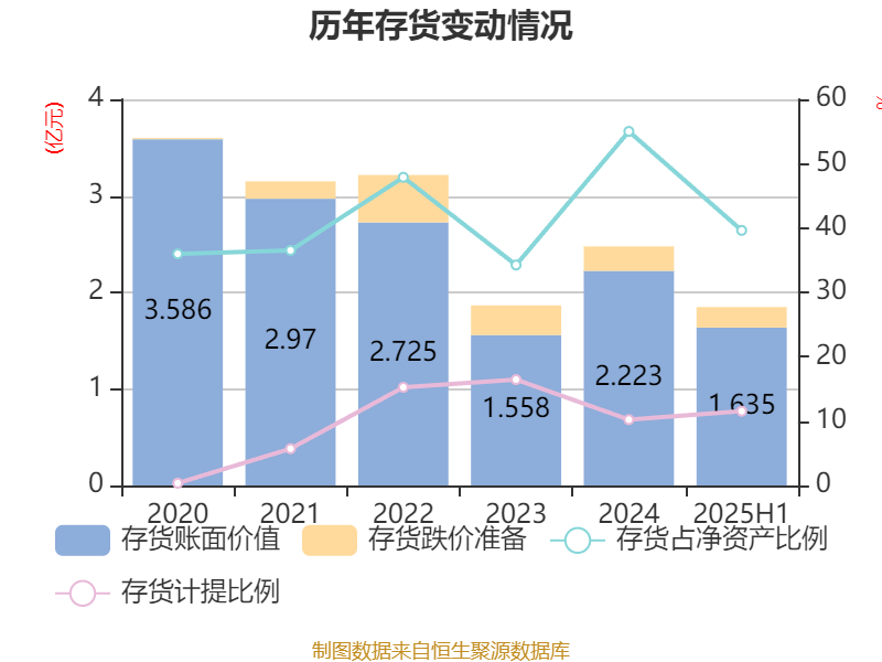 从存货变动来看,截至2025年上半年末,公司存货账面价值为1.64亿元,占净资产的39.63%,较上年末减少5877.79万元。其中,存货跌价准备为2133.22万元,计提比例为11.54%。