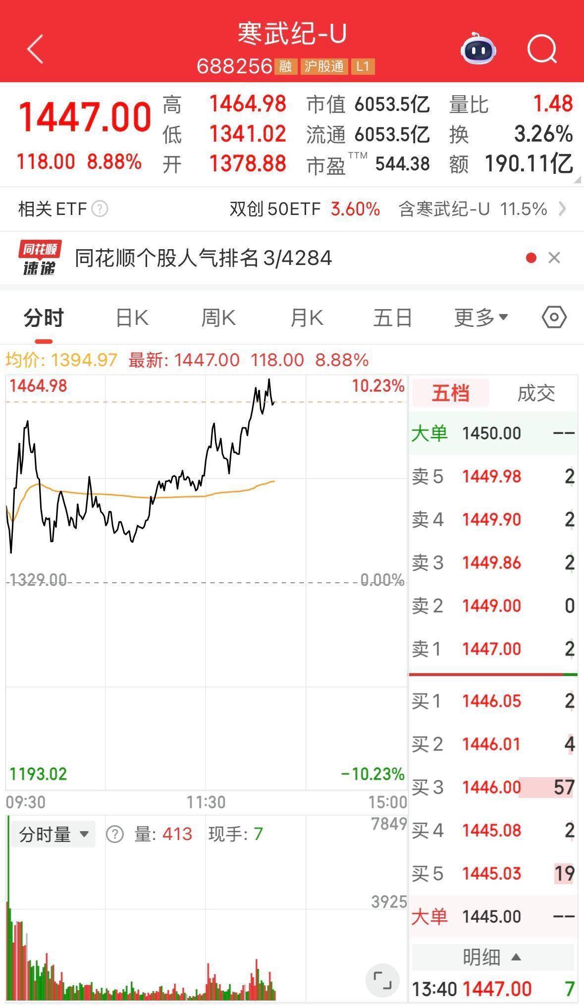 8月27日盘中,寒武纪股价超越贵州茅台,晋升A股“股王”,最高报1464.98元/股创通网,年内涨幅超120%。