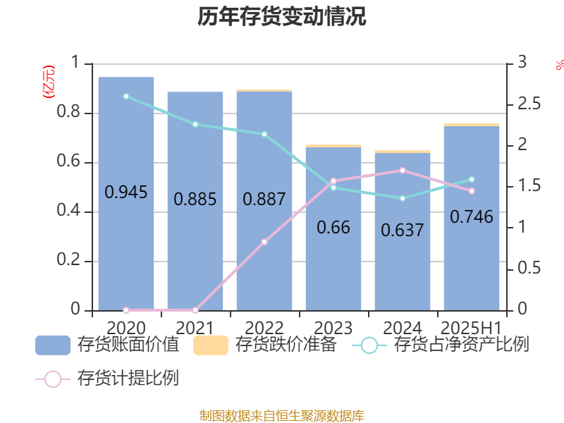 从存货变动来看,截至2025年上半年末,公司存货账面价值为7461.37万元,占净资产的1.59%,较上年末增加1093.31万元。其中,存货跌价准备为109.85万元,计提比例为1.45%。