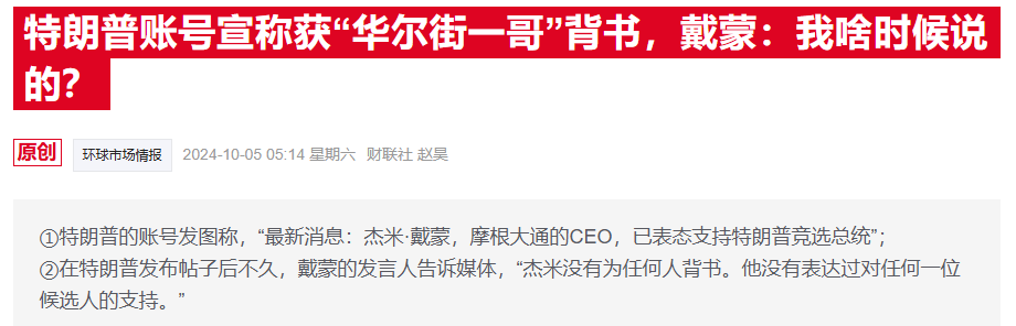 值得一提的是,去年大选时,共和党/保守派方面也曾出现过这种尴尬情景。当时,包括特朗普在内多位共和党人在社交媒体上宣称,摩根大通CEO杰米·戴蒙“已表态支持特朗普”。