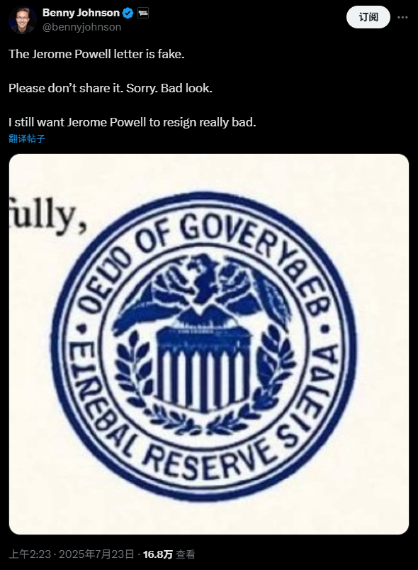 本尼·约翰逊转发时写道,“号外!美联储主席鲍威尔辞职了。”后来两人都删除了帖子,但截图已被媒体和网友们保存了下来。