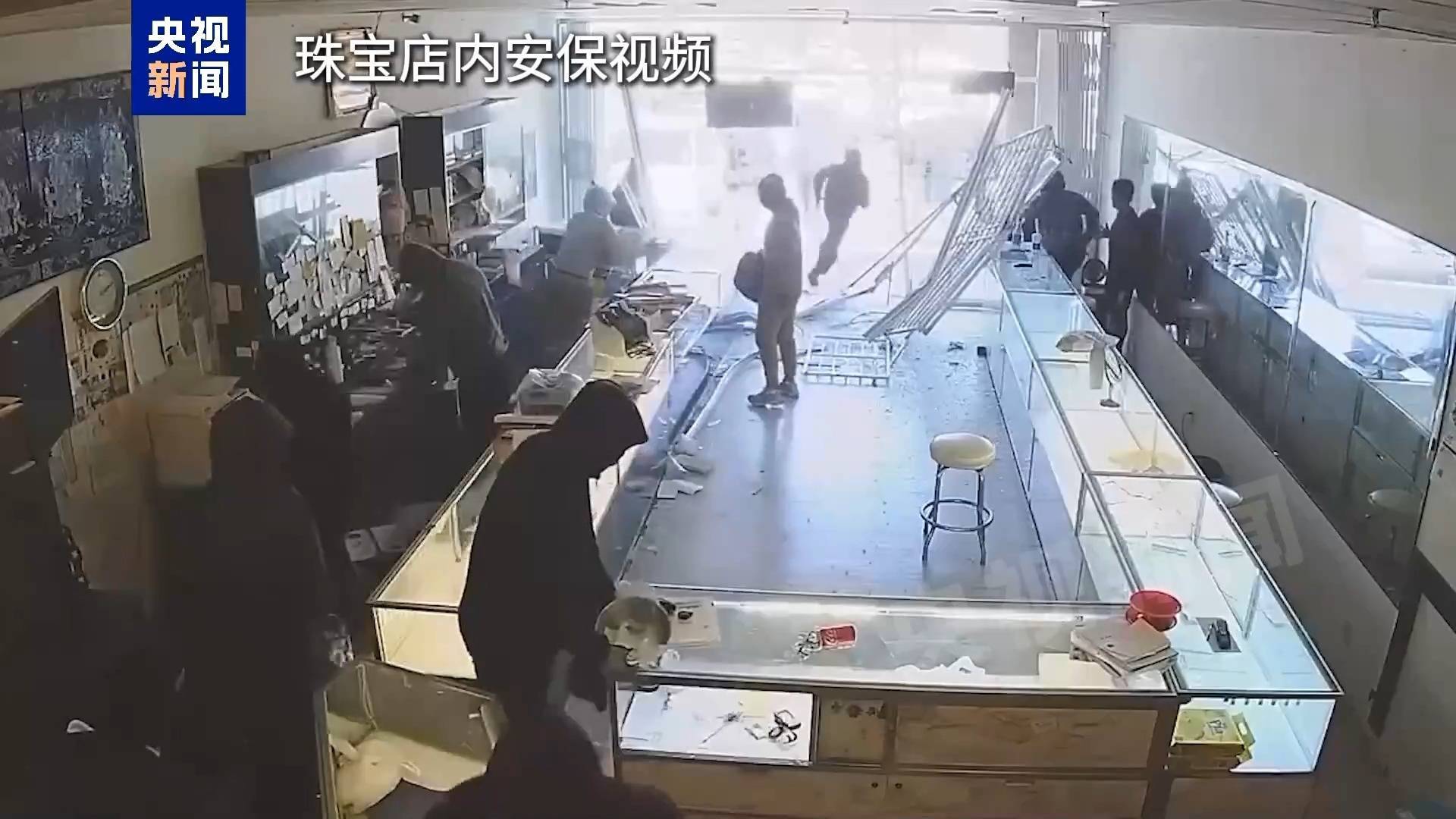 歹徒用锤子砸开玻璃展示柜,几秒钟工夫,柜里和货架上的珠宝就被洗劫一空。他们听到店外有汽车鸣笛后就迅速逃走,整个事件持续不超过2分钟。